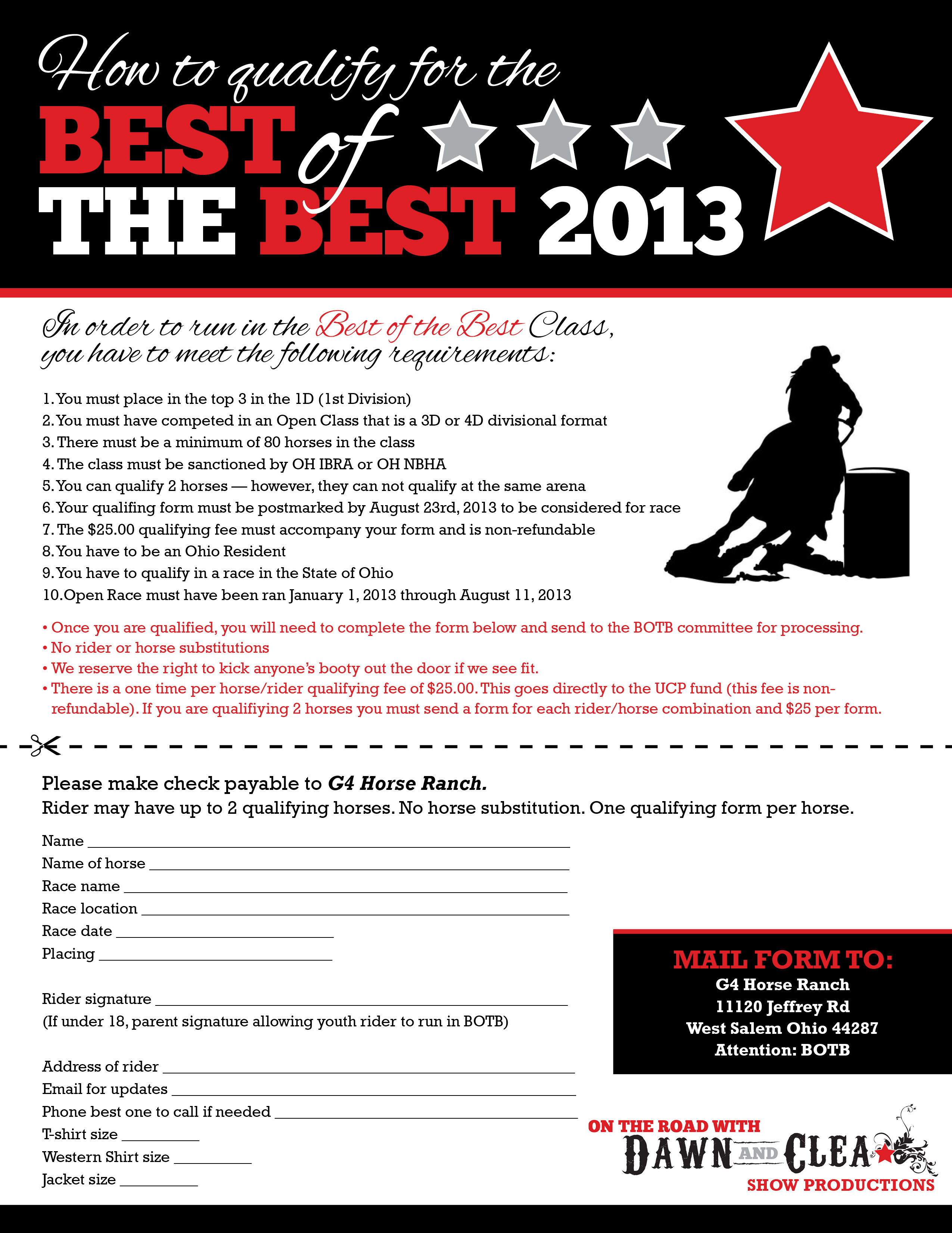 Keep an eye on the web for all the information, forms, pre entry and showbills – Sign up through your email on the front page of the website www.ontheroadwithdawnandclea.com to receive email when a new post is up!