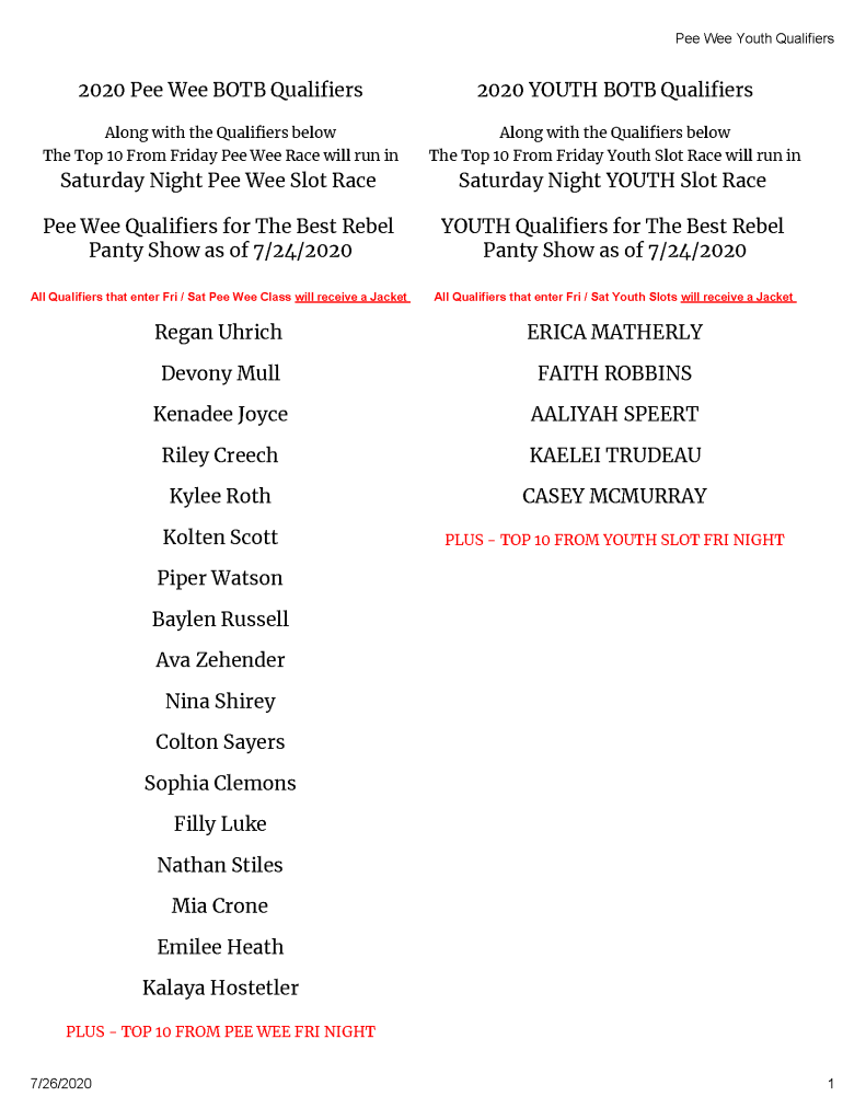 YOUTH and PEE WEE Qualifiers please see below and congrats the Sponsors stepped up and ALL Pee Wee and Youth Qualifiers that enter the perspective Slot Races will receive a Jacket!