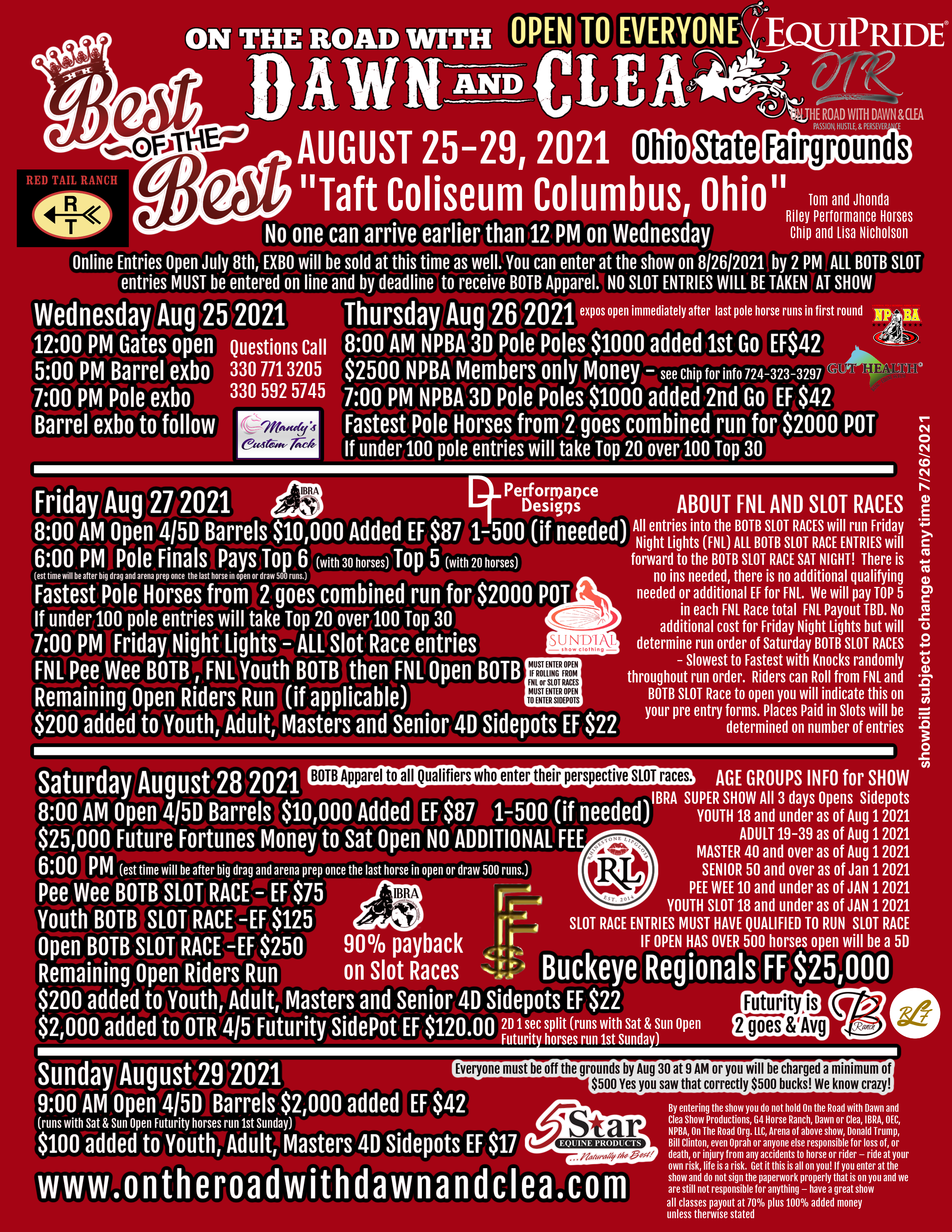 Payout will be at the show for Thursday, Friday and Saturday – Each payout will be available the following day or you can have someone pick you your winnings or you can leave your PayPal address for your winnings – we will NOT be mailing checks. Sunday’s winnings along with any that were NOT picked up will be sent PayPal within the following week. If you do not have PayPal please leave your address at the office.